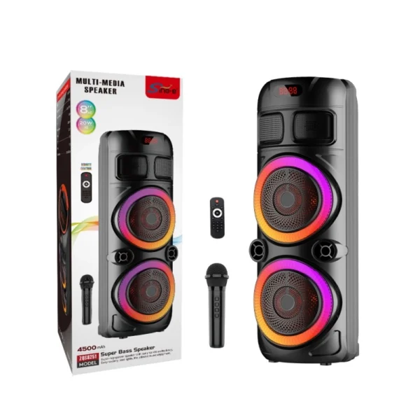 - Funkcije: Karaoke (bežični mikrofon uključen), FM radio, RGB svjetlosni efekti, TWS (uparenje dva zvučnika), daljinski upravljač